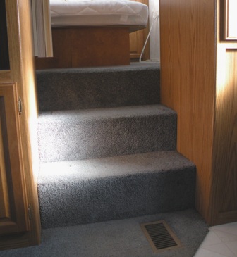 Standing there looking at how big that partially complete box was... it seemed like a shiny idea... so 'change order' #2! :-) The result is shown in this view of the installed RV Stairs; I had to decide how to set the hinges. They could either be simply screwed to the tread and to the back of the stair... like on the right side here... or mortised in... as on the left... Well... the mortised in option is obviously the better looking... so I had to cut those Mortises... Had to wait a couple more days for the time to build and install the second of the RV Storage Stairs... But, the work got done... and now that wasted space of the original RV stairs is utilized with our brand new RV Storage Stairs. Return from RV Storage Stairs to Goin' RV Boondocking