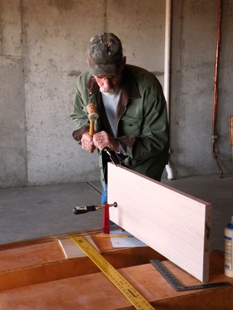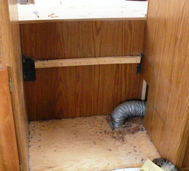 While tearing out the RV carpeting to replace it with Allure vinyl flooring I discovered how poorly built the original stairs were. The carpet itself was used as part of the structure! With it gone, the remaining stair structure left little to work with. I'd planned on simply removing the treads and install hinged lids to create the storage space... but there'd be no frame or structure left to hinge anything off of. So... being used to engineering on the fly, I gathered up the materials; Baltic Birch plywood, Brass Hinges, a hasp, and 1" thick, oak treads, to build solid, attractive, RV storage stairs. They'll be built in the form of two 'boxes'. The first and largest of the boxes will be used for Dog Food Storage. One of our dogs, Buck, is afflicted with an insatiable hunger :-) ... he's taken to breaking in to any 'unprotected' food storage and eating his fill... so, constantly moving the plastic storage box to a safe location every time we leave the rig, without the dogs, has become an irritating routine... lest he tear off the plastic lid! The second and smaller of the RV storage stairs is to be used for shoes... much better to my mind than putting dirty shoes in the limited closet space... or cluttering up the bedroom floor. Of course, as seen in previous pages, doing the remodeling demolition work was the first task. The orginal, carpeted RV stairs had to be uncovered. That danged Ol' Murphy fella really gets under my skin on occasion... I can hear that saucy lil' Irishman laughin' now! Well Ha! Your pathetic lil' pranks have to get a lot more athletic than that ya grubber! I'll just put a 'notch' in that rear box, to fit around the RV Heater Duct work. Ha! With measurements in hand I went to cuttin' wood... gluing and finish nailing... and came up with this first box of my new RV storage stairs; ... If they come apart... it's because somebody drove a Buick through the door!